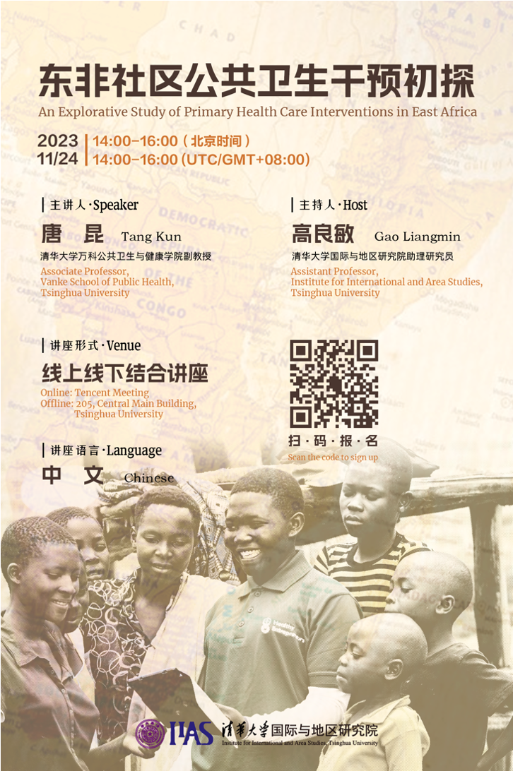 On 24 November 2023, from 2:00 p.m. to 4:00 p.m., the Sub-Saharan African Studies Research Group of the Institute for International and Area Studies (IIAS) of Tsinghua University hosted the second lecture of the Fall Semester 20223-2024 on "An Explorative Study of Primary Health Care Interventions in East Africa". The lecture was delivered by Dr. Kun Tang, Associate Professor, Vanguard School o...