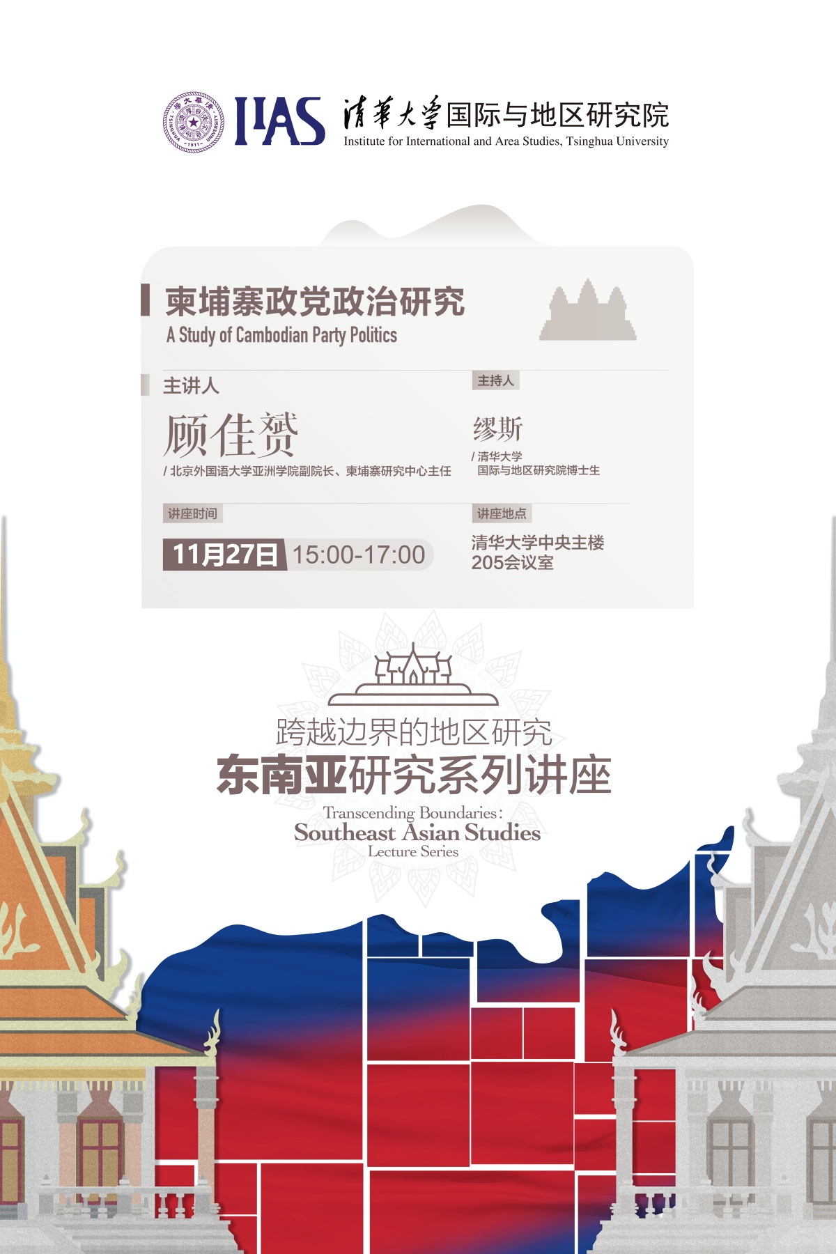 On the afternoon of November 27th, 2020, the 7th session of ” Area Studies Across the Boundaries: Southeast Asian Studies” Series Lectures” was held at Conference Room 205 of the Central Main Building of Tsinghua University, with the theme of ” A Study of Cambodian Party Politics”, delivered by Prof. Gu Jiayun, Associate Professor and Vice Dean of School of Asian Studies and Director of Khmer Study Centre at Beijing Foreign Studies University.