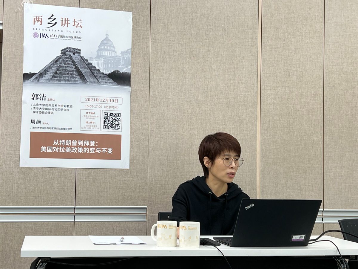 • On December 10, 2021, the sixth lecture of “Liangxiang Forum” hosted by Institute for International and Area Studies of Tsinghua University of the autumn semester of 2021 was successfully held. This lecture is given by Guo Jie, associate professor in the Department of International Relations of Peking University. The theme of the lecture is “From Trump to Biden: The Changes and Consistencies in the U.S Policy towards Latin America”. Zhou Yan, assistant professor of the IIAS, presided over the lecture. Researchers of area studies, and doctoral students attended the lecture.