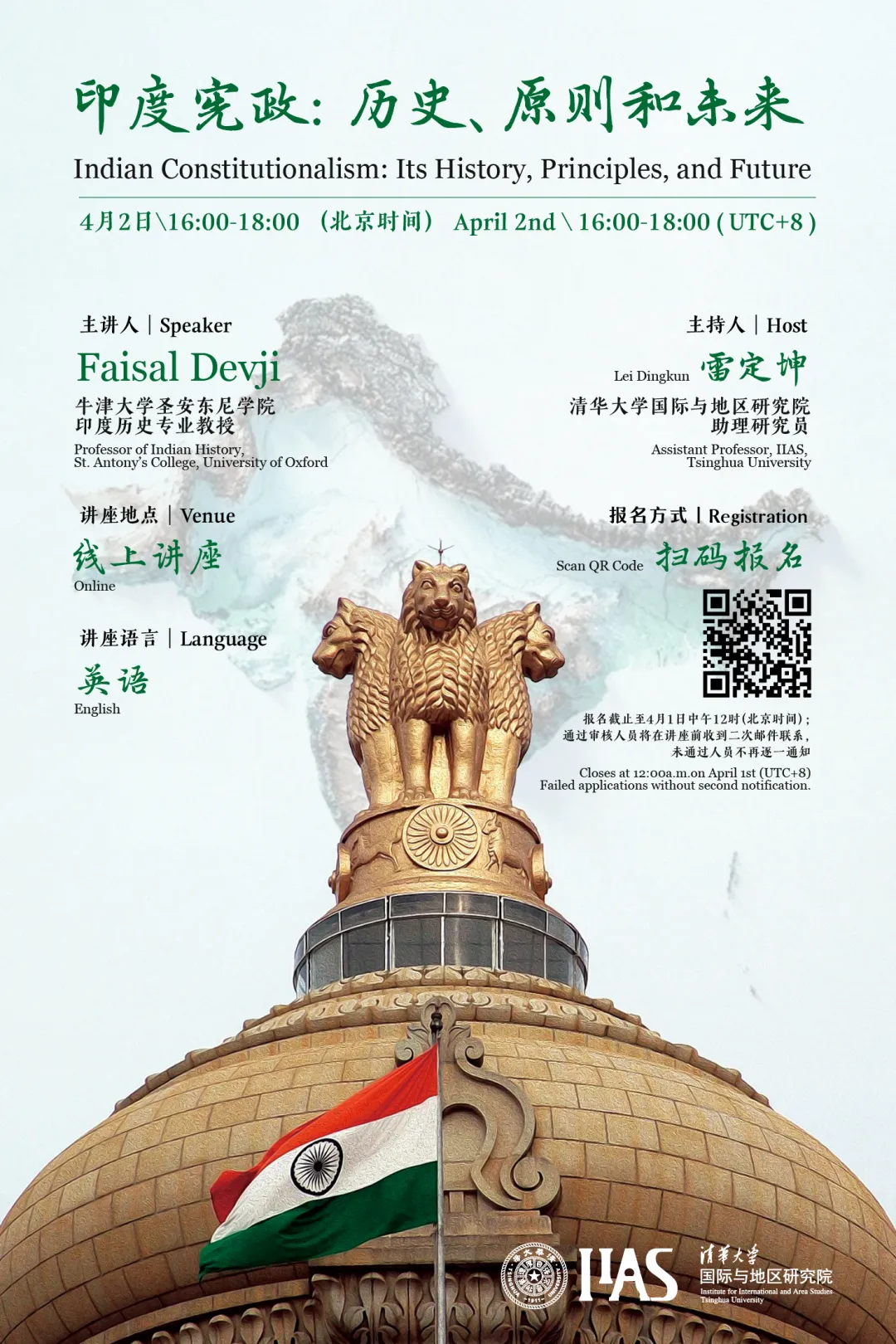 • On the afternoon of 2 April 2024, Dr. Faisal Devji, Professor of Indian History at St. Antony's College, University of Oxford, gave an online lecture on the theme of "Indian Constitutionalism: Its History, Principles, and Future", moderated by Dr. Lei Dingkun, Assistant Professor at Institute for International and Area Studies, Tsinghua University (IIAS).