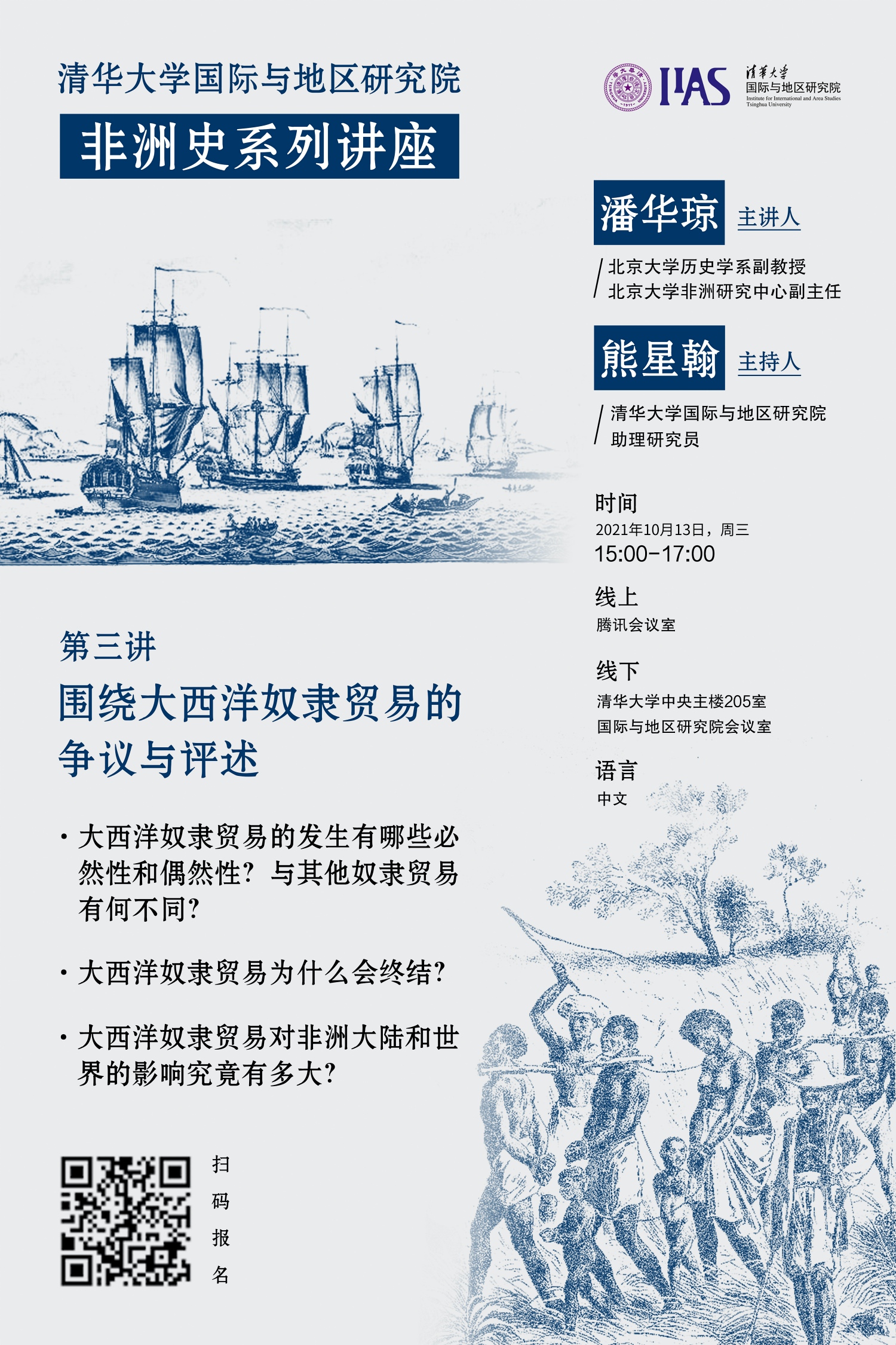• 2021年10月13日下午,High漫画 (IIAS)非洲史系列讲座第三讲在中央主楼205会议室召开,主题为“围绕大西洋奴隶贸易的争议与评述”。本次讲座由北京大学历史学系副教授、北京大学非洲研究中心副主任潘华琼老师主讲,High漫画 助理研究员熊星翰主持。地区High漫画博士生及研究员参加了现场的线下讲座,国内外各高校、机构的学者、学生以及对相关议题感兴趣的人士参加了线上讲座。