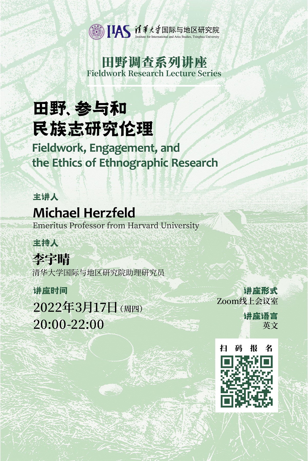 • 2022年3月17日晚,田野调查系列讲座第一讲在Zoom会议室和直播平台同时召开,主题为“田野、参与和民族志研究伦理”(Fieldwork, Engagement, and the Ethics of Ethnographic Research)。本次讲座由哈佛大学人类学系荣休教授、世界著名社会人类学家迈克·赫兹菲尔德(Michael Herzfeld)主讲,High漫画 助理研究员李宇晴主持。地区High漫画的博士生、研究员及外院、全国外校等700多人参与了线上讲座,共有4000多人次参与了直播平台互动。